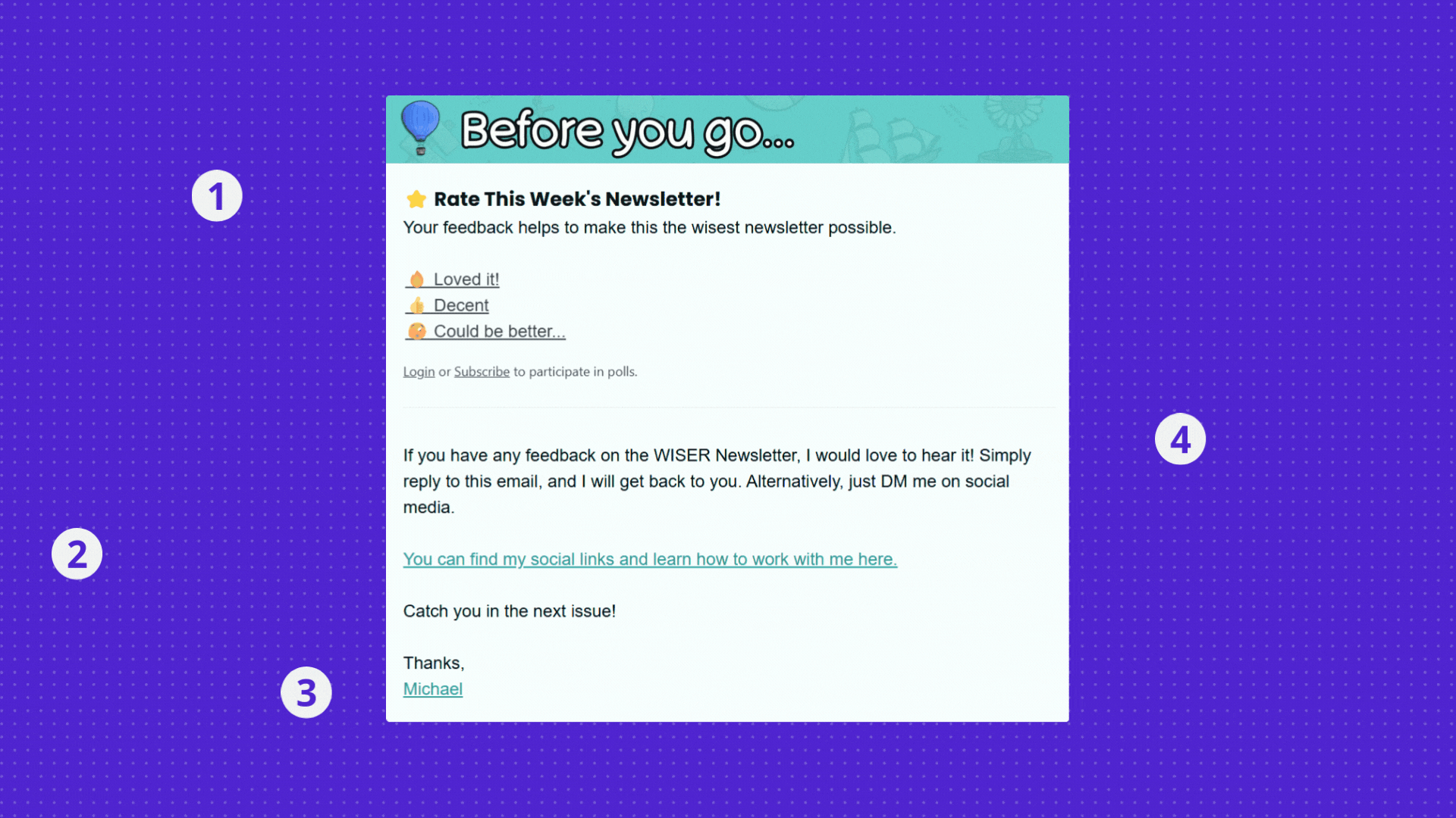 Anybody can share BS they have collected from the web, often just for the sake of making a buck (affiliate links to products they have never used). Michael from Wiser is genuine about what he shares. Newsletter design isnโt just about looking good, it is also about how you position yourself and your brand.